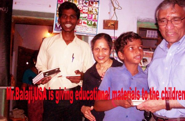 Mr. Jegan Tharmaraj with sponsors from USA donating educational materials.